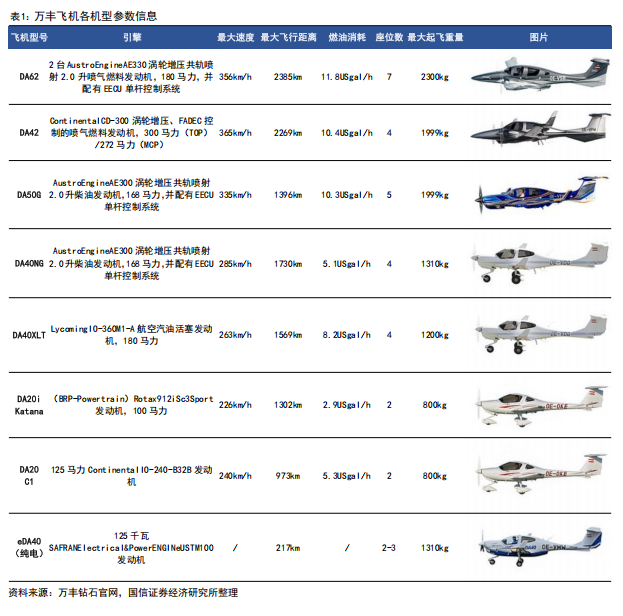 公司通航飞机创新制造业务采用“研发-授权/技术转让-整机制造和销售-售后服务”循环进阶的商业模式。旗下钻石飞机在整机设计研发、发动机制造技术、新材料技术和先进制造领域具备同行领先的技术研发优势,是欧洲为数不多的欧洲航空安全局(EASA)批准的 DOA(飞机设计组织),储备了大量的通用航空研发设计人才,在全球拥有大量通用飞机研发与设计技术储备。目前拥有奥地利、加拿大、捷克、德国四大飞机设计研发中心及国内一个省级工程研究中心,以及奥地利、加拿大、中国(青岛、新昌、滨州)五大飞机制造基地。万丰钻石飞机拥有 18 款机型的知识产权,客户遍布欧洲、北美、亚太和中东等区域,DA40NG、DA50RG、DA62 等主力机型已经被广泛应用于培训、私人出行、特殊用途等领域,在全球范围内具备良好的品牌影响力。