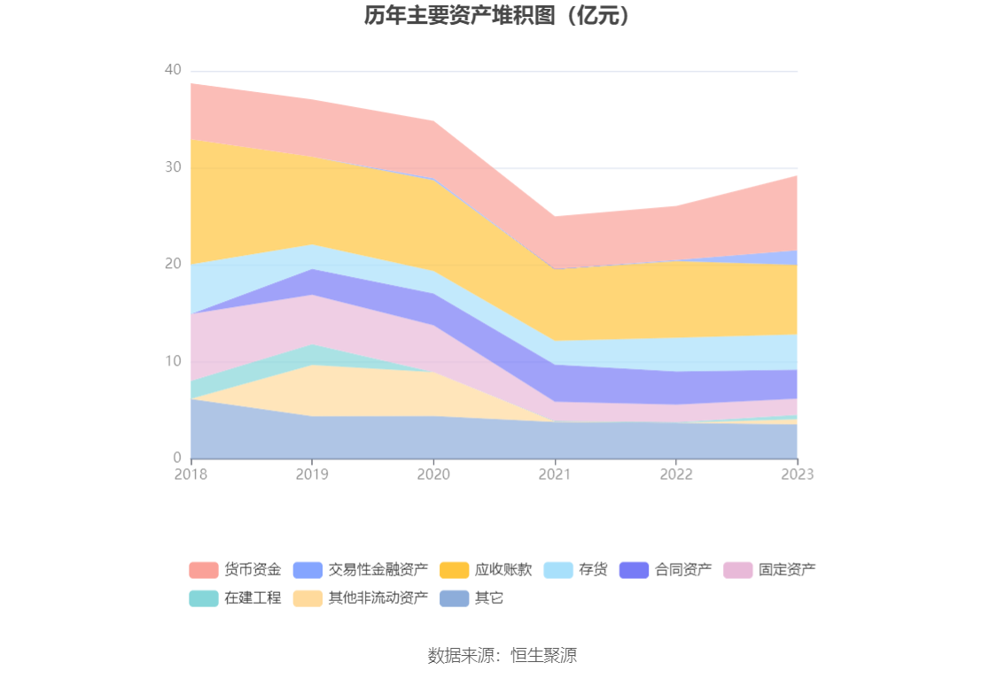 资产重大变化方面,截至2023年年末,公司应收账款较上年末减少9.39%,占公司总资产比重下降5.78个百分点;货币资金较上年末增加38.28%,占公司总资产比重上升5.02个百分点;交易性金融资产较上年末增加1261.33%,占公司总资产比重上升4.72个百分点;合同资产较上年末减少12.73%,占公司总资产比重下降2.89个百分点。