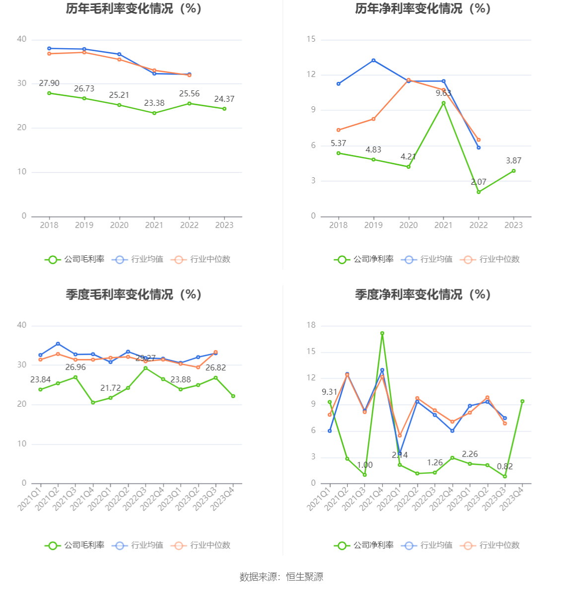 2023年,公司毛利率为24.37%,同比下降1.19个百分点;净利率为3.87%,较上年同期上升1.80个百分点。从单季度指标来看,2023年第四季度公司毛利率为22.18%,同比下降4.29个百分点,环比下降4.64个百分点;净利率为9.40%,较上年同期上升6.45个百分点,较上一季度上升8.58个百分点。