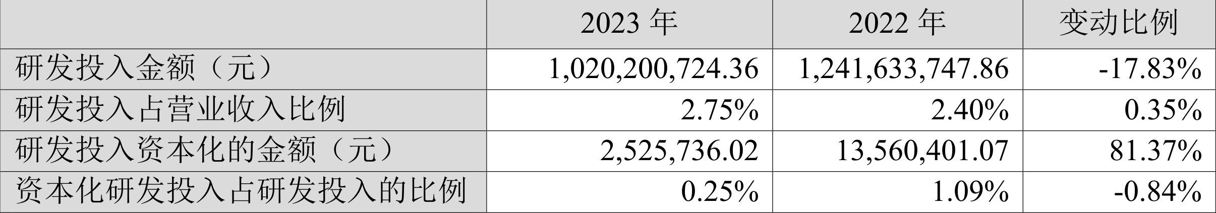 2023年全年,公司研发投入金额为10.20亿元,同比下降17.83%;研发投入占营业收入比例为2.75%,相比上年同期上升0.35个百分点。此外,公司全年研发投入资本化率为0.25%。