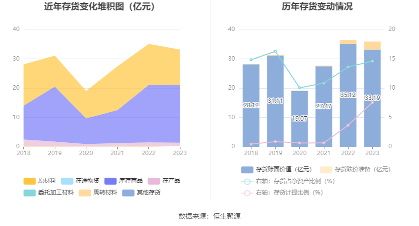 从存货变动来看,截至2023年年末,公司存货账面价值为33.19亿元,占净资产的14.62%,较上年末减少1.94亿元。其中,存货跌价准备为2.71亿元,计提比例为7.56%。