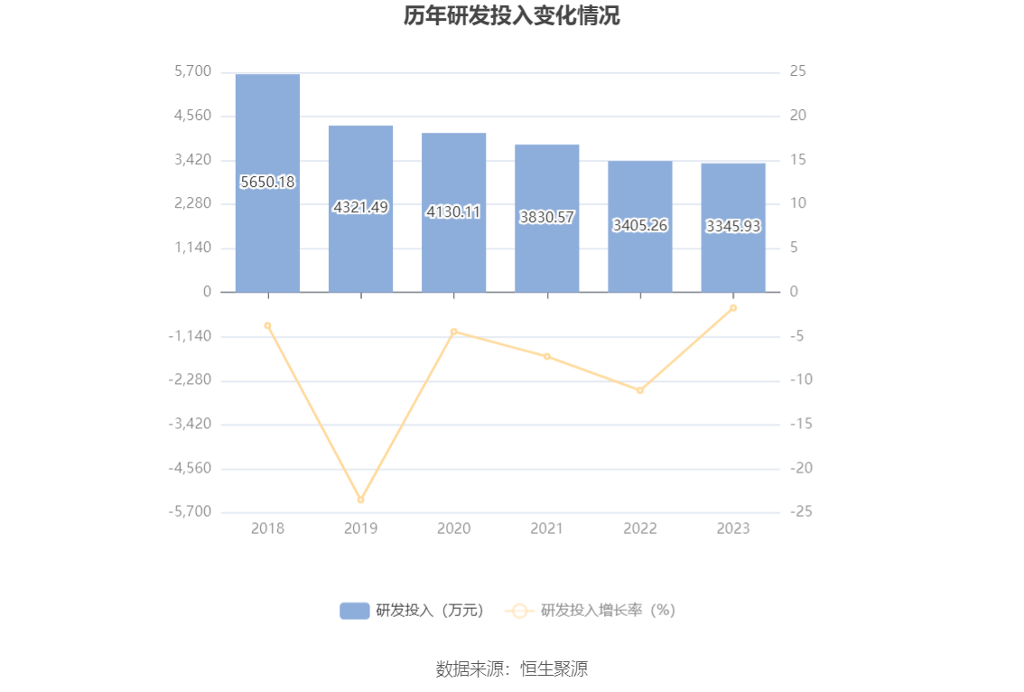 2023年全年,公司研发投入金额为3345.93万元,同比下降1.74%;研发投入占营业收入比例为6.28%,相比上年同期下降0.34个百分点。此外,公司全年研发投入资本化率为0。