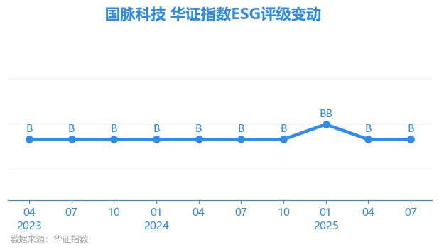 日前,华证指数公布了新一期(2025年7月31日)的ESG评级结果,国脉科技(002093.SZ)获得B评级(华证指数评级为C起至AAA九档,C为最低档,AAA为其最高一级评级/AA为其第二档),上一期(2025年4月30日)ESG评级为B。本期ESG评级在143家信息技术服务行业A股上市公司中排名第71(上一期排名第82)。