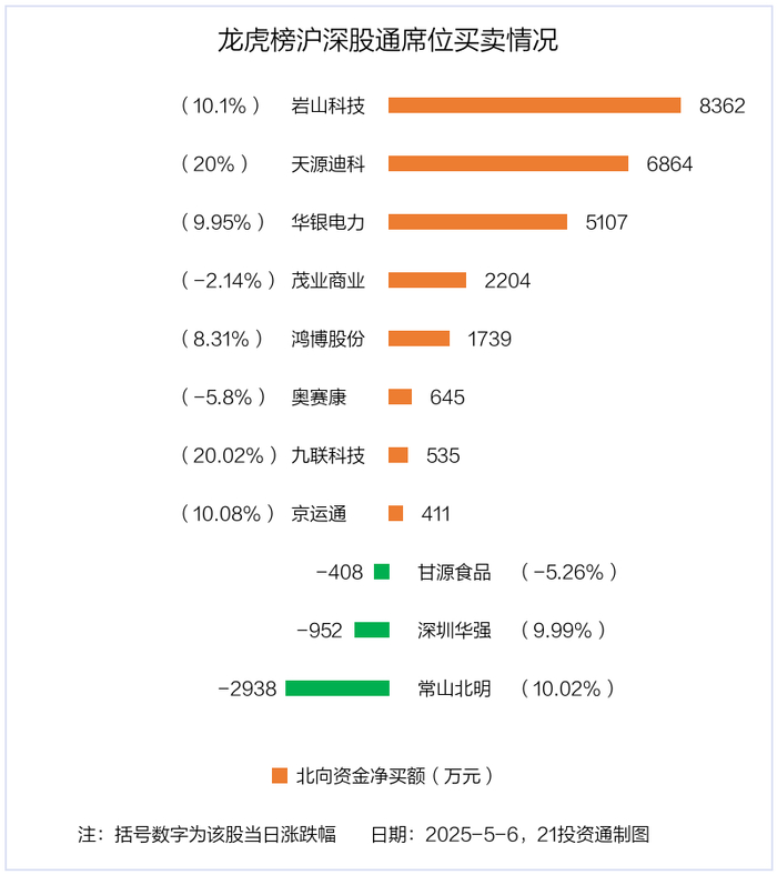 5月6日,北向资金参与龙虎榜中的个股共有11只,合计净买入2.16亿元。其中沪股通净买入4 股,合计净买入8257.02万元;深股通净买入4 股,净卖出3 股,合计净买入1.33亿元。