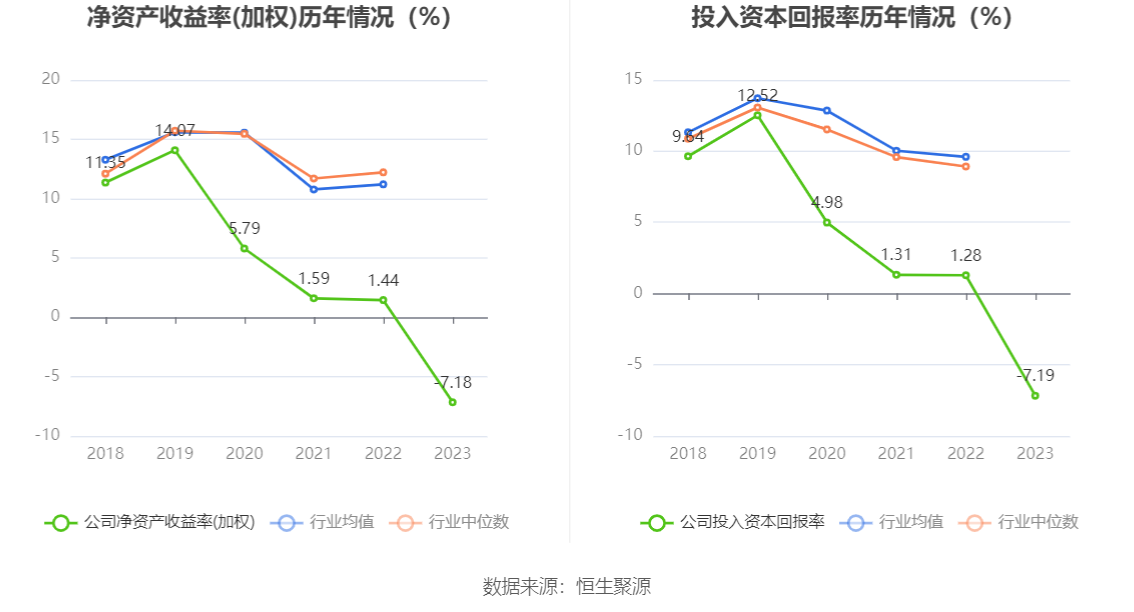 数据显示,2023年公司加权平均净资产收益率为-7.18%,较上年同期下降8.62个百分点;公司2023年投入资本回报率为-7.19%,较上年同期下降8.47个百分点。