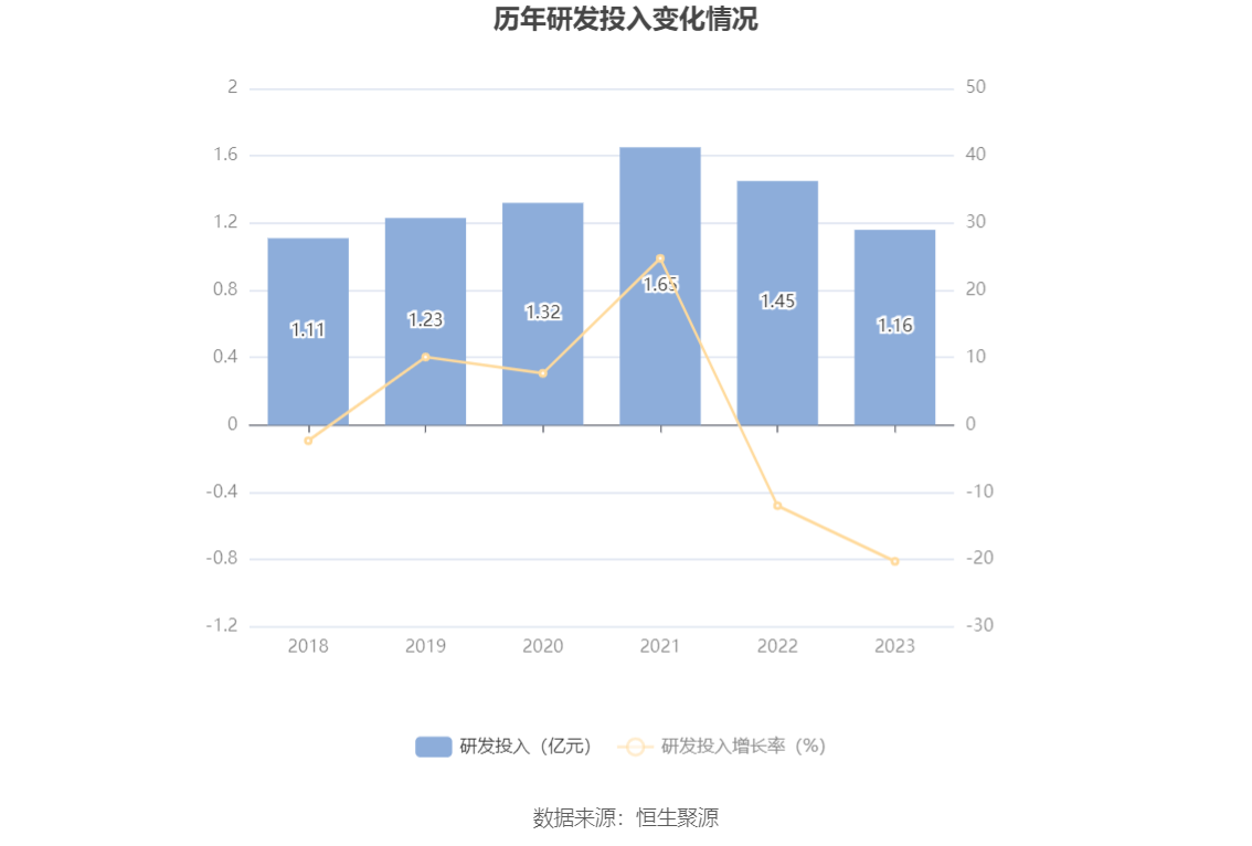 2023年全年,公司研发投入金额为1.16亿元,同比下降20.25%;研发投入占营业收入比例为5.32%,相比上年同期下降0.04个百分点。此外,公司全年研发投入资本化率为0。