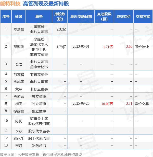 能特科技的高管列表及最新持股情况如下: