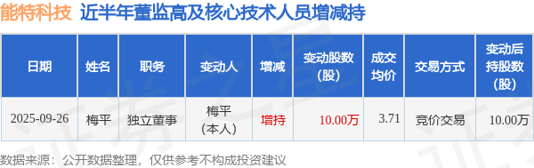 能特科技:9月26日高管梅平增持股份合计10万股