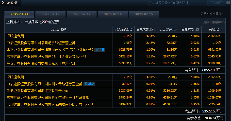 恒宝股份(002104)今日跌2.41%,成交额43.25亿元,换手率33.13%,盘后龙虎榜数据显示,深股通专用席位买入2.14亿元并卖出2.38亿元。杭州帮席位净卖出1.1亿元。