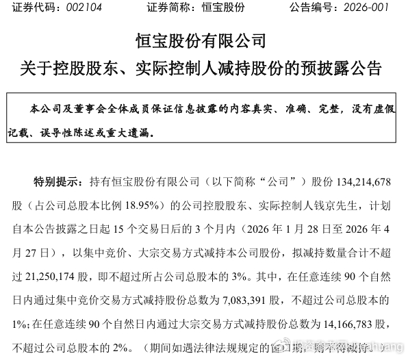 1月6日,恒宝股份(002104.SZ)公司公告显示,控股股东、实控人兼董事长钱京计划在1月28日至4月27日期间,通过集中竞价与大宗交易方式减持不超过2125.02万股,占公司总股本3%,以当日20.74元/股的收盘价测算,本轮最高可套现4.41亿元。而就在公告发布前,恒宝股份刚交出了一份净利润同比暴跌超90%的三季度财报,低薪高管与高额套现的强烈反差,叠加业绩持续低迷的现实,让投资者对这家身处数字经济风口的企业充满疑问。