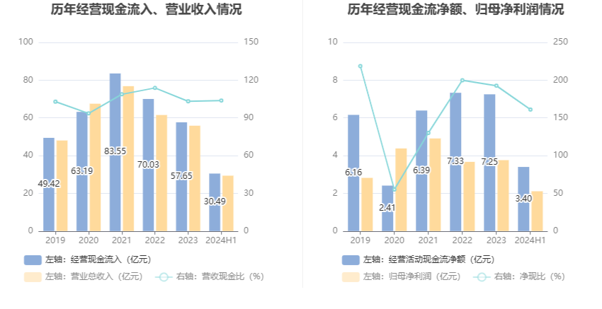 2024年上半年,公司营业收入现金比为103.82%,净现比为161.04%。