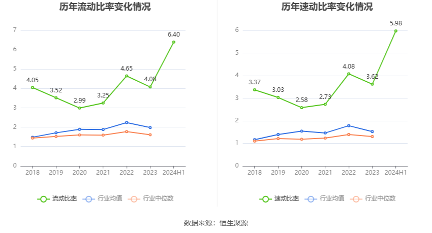 2024年上半年,公司流动比率为6.40,速动比率为5.98。