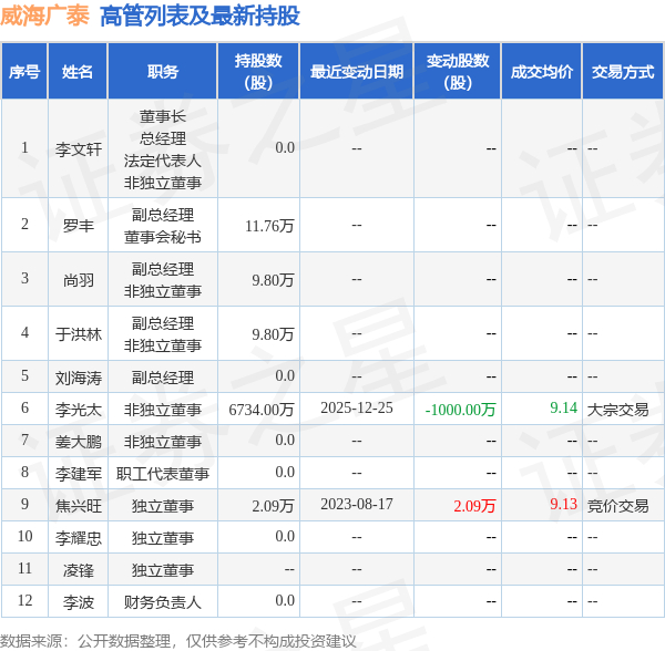 威海广泰近半年内的董监高及核心技术人员增减持详情如下: