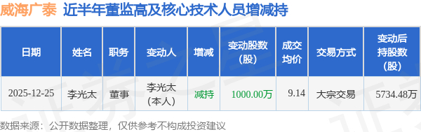 威海广泰:12月25日高管李光太减持股份合计1000万股