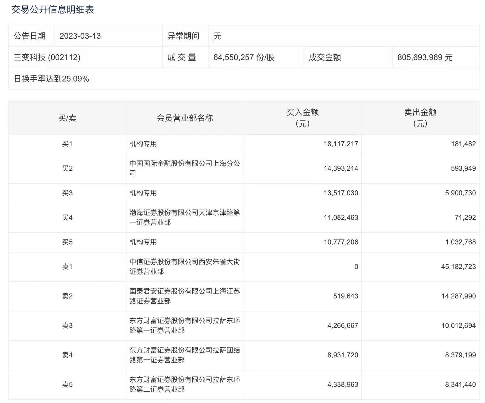 3月13日,三变科技今日涨0.97%,龙虎榜数据显示,上榜营业部席位全天成交1.8亿元,占当日总成交金额比例为22.33%。其中,买入金额为8594.41万元,卖出金额为9398.43万元,合计净卖出804.01万元。