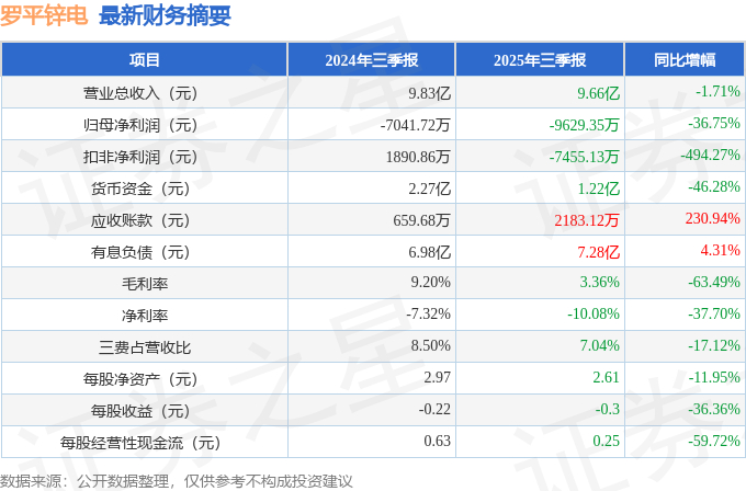 据证券之星公开数据整理,近期罗平锌电(002114)发布2025年三季报。截至本报告期末,公司营业总收入9.66亿元,同比下降1.71%,归母净利润-9629.35万元,同比下降36.75%。按单季度数据看,第三季度营业总收入4.45亿元,同比上升59.35%,第三季度归母净利润-410.33万元,同比上升94.36%。本报告期罗平锌电短期债务压力上升,流动比率达0.33。