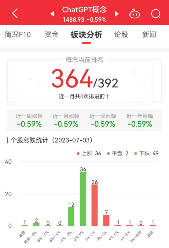 中国经济网北京7月3日讯今日,ChatGPT概念板块整体涨幅-0.59%,其中36只股票上涨,2只股票平盘,49只股票下跌。