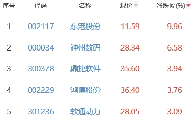 其中,东港股份、神州数码、鼎捷软件、鸿博股份、软通动力位列板块涨幅前五位,涨幅分别为9.96%、6.58%、3.94%、3.76%、3.09%。