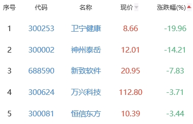 卫宁健康、神州泰岳、新致软件、万兴科技、恒信东方位列涨幅榜后五位,涨幅分别为-19.96%、-14.21%、-7.83%、-3.71%、-3.44%。