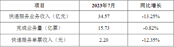 8月18日公告,7月快递服务业务收入34.57亿元,同比下降13.25%。