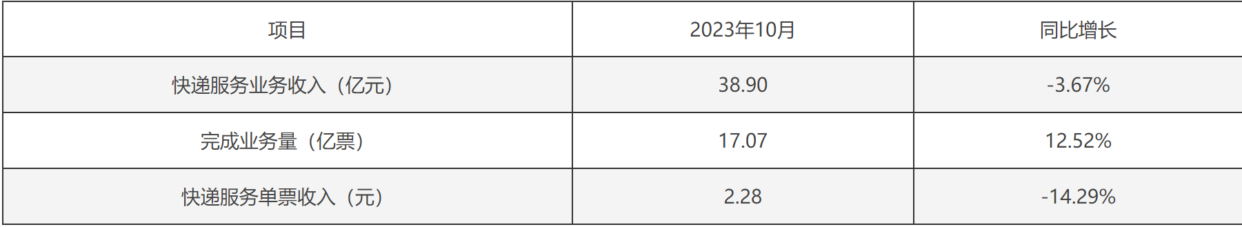 11月19日公告,公司10月快递服务业务收入38.9亿元,同比下滑3.67%。