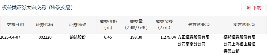 韵达股份今日大宗交易平价成交198.3万股,成交额1279.04万元
