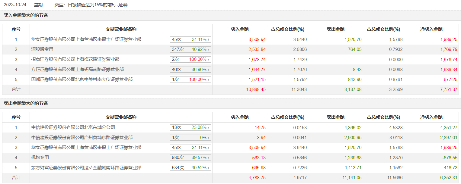 汇洲智能(维权)10月24日涨7.22%,全天换手率达12.42%,振幅达15.24%。龙虎榜数据显示,营业部席位合计净卖出590.18万元。其中,机构买入563.13万元,卖出1239.68万元,合计净卖出676.55万元。此外,华泰证券上海黄浦区来福士广场证券营业部、深股通专用分别买入3509.94万元、2533.84万元;中信建投证券北京东城分公司、中信建投证券广州黄埔东路证券营业部分别卖出4366.02万元、2900.95万元。