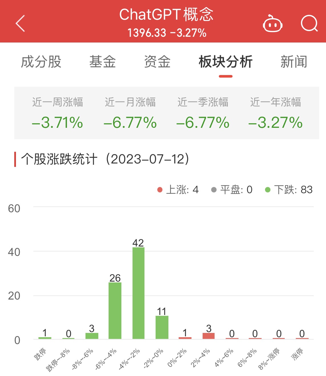 中国经济网北京7月12日讯今日,ChatGPT概念板块整体涨幅-3.27%,其中4只股票上涨,0只股票平盘,83只股票下跌。