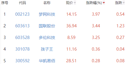 其中,梦网科技、国联股份、多伦科技、孩子王和华凯易佰位列板块涨幅前五位,涨幅分别为3.97%、3.44%、3.25%、0.36%和0.28%。