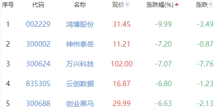 鸿博股份、神州泰岳、万兴科技、云创数据和创业黑马位列涨幅榜后五位,涨幅分别为-9.99%、-7.20%、-7.07%、-6.80%和-6.63%。