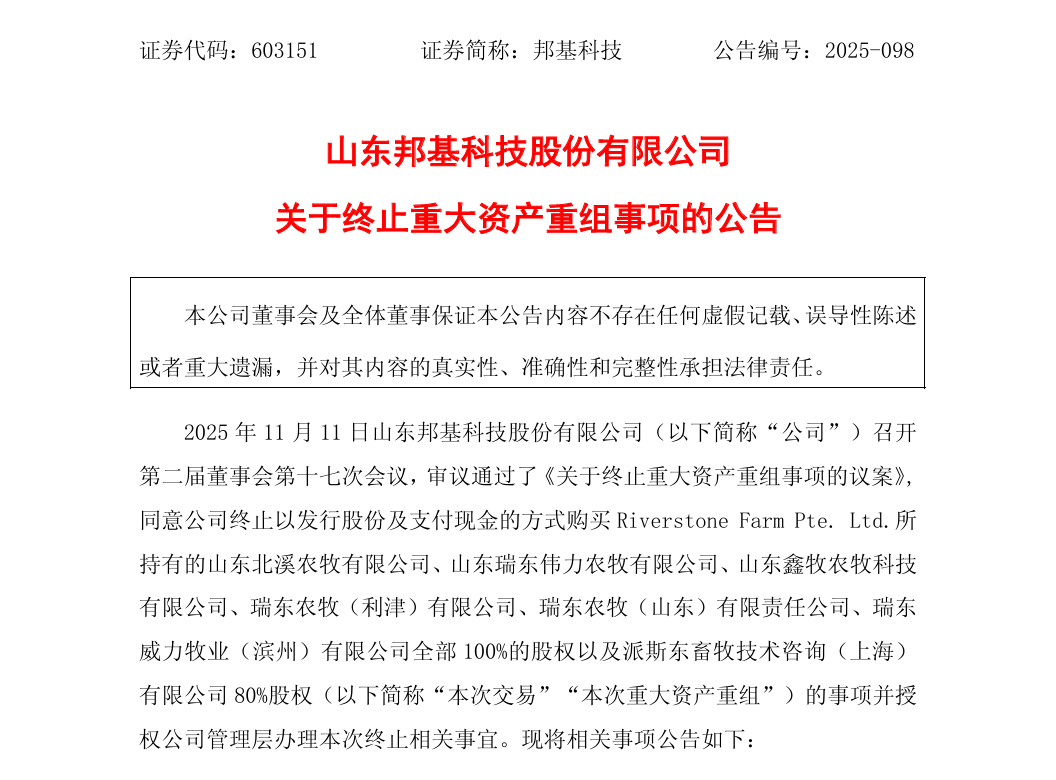 11月11日晚,邦基科技发布公告称,经董事会审慎研究决定终止筹划中的重大资产重组事项。