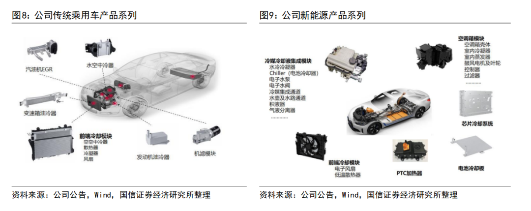 2020年公司新能源产品形成了1+4+N的产品体系,其中1为新能源热管理系统,4为前端冷却模块、冷媒冷却液集成模块、空调箱模块、车载电子冷却系统,N为热交换器、水冷板、PTC、泵、阀、管路等零部件。公司从单一换热器零部件供应商逐步向系统集成供应商升级,提升配套价值量与综合竞争力。