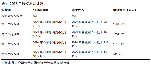 公司2022年股权激励计划授予公司董事、高管、核心员工等共计388人,强化对净利润的要求。本次股权激励计划对于归母净利润率的考核权重占55%,具体的,对于2022-2025年,公司营收分别不低于90、108、130、150亿元,归母净利润不低于4.0、5.4、7.8、10.5亿元,2024年公司达成股权激励目标。2025年公司股权激励目标为营业收入不低于150亿元,净利润不低于10.5亿元。