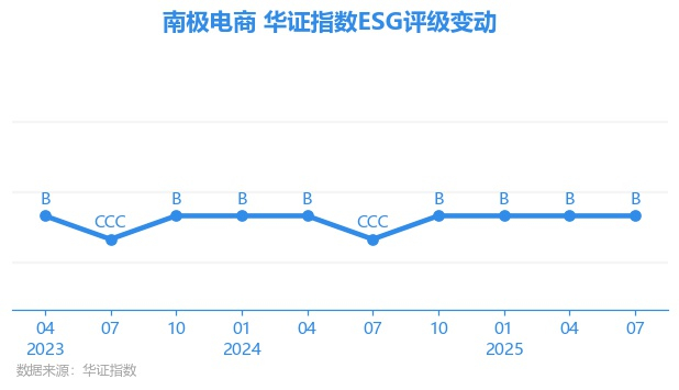 日前,华证指数公布了新一期(2025年7月31日)的ESG评级结果,南极电商(002127.SZ)获得B评级(华证指数评级为C起至AAA九档,C为最低档,AAA为其最高一级评级/AA为其第二档),上一期(2025年4月30日)ESG评级为B。本期ESG评级在143家信息技术服务行业A股上市公司中排名第92(上一期排名第115)。