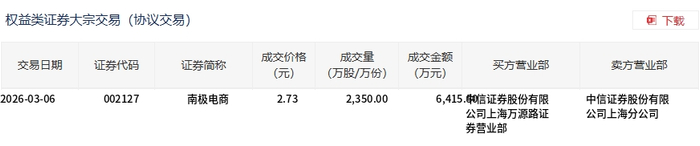 3月6日,南极电商大宗交易成交2350万股,成交额6415.5万元,占当日总成交额的48.27%,成交价2.73元,较市场收盘价3.03元折价9.9%。