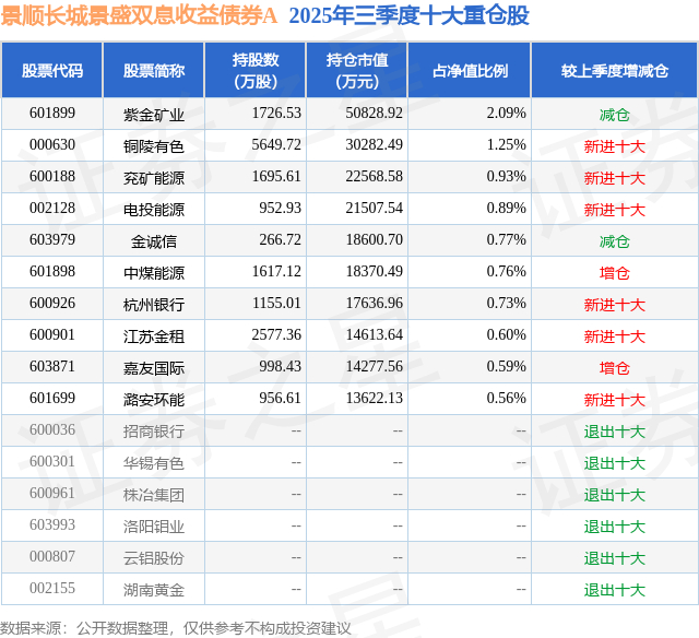 根据2025基金Q3季报公募基金重仓股数据,重仓该股的公募基金共32家,其中持有数量最多的公募基金为景顺长城基金的景顺长城景盛双息收益债券A。景顺长城景盛双息收益债券A目前规模为191.09亿元,最新净值1.234(11月5日),较上一交易日上涨0.08%,近一年上涨8.82%。该公募基金现任基金经理为李怡文 邹立虎 李曾卓卓。李怡文在任的基金产品包括:景顺长城景颐双利债券A,管理时间为2021年4月30日至今,期间收益率为24.67%;景顺景颐招利6个月持有期债券A,管理时间为2021年4月30日至今,期间收益率为34.29%;景顺长城安泽回报一年持有混合A,管理时间为2021年4月30日至今,期间收益率为40.65%;景顺景颐嘉利6个月持有期债券A,管理时间为2021年6月16日至今,期间收益率为22.78%。邹立虎在任的基金产品包括:景顺长城安盈回报一年持有混合A,管理时间为2021年11月16日至今,期间收益率为41.81%;景顺景颐招利6个月持有期债券A,管理时间为2022年3月12日至今,期间收益率为26.68%;景顺长城华城稳健6个月持有期混合A,管理时间为2022年3月12日至今,期间收益率为30.23%。