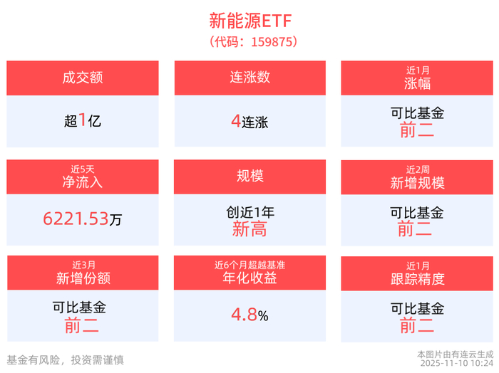 截至2025年11月10日10:24,中证新能源指数上涨0.31%,成分股TCL中环10cm涨停,天华新能上涨8.48%,恩捷股份上涨6.76%,迈为股份上涨6.66%,盛新锂能上涨6.08%。新能源ETF(159875)上涨0.55%,冲击4连涨。