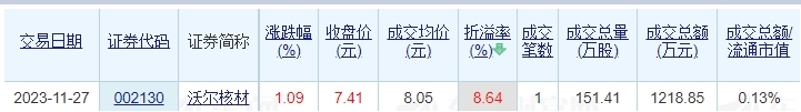 上证报中国证券网讯 据东方财富Choice数据,沃尔核材11月27日共有1笔大宗交易,总成交数量为151.41万股,总成交金额为1218.85万元,成交价为8.05元,溢价率为8.64%。