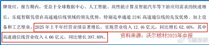 2025年上半年,公司生产的224G高速通信线已实现量产,多通道1.6T高速通信线也已完成了重要客户的验证工作。