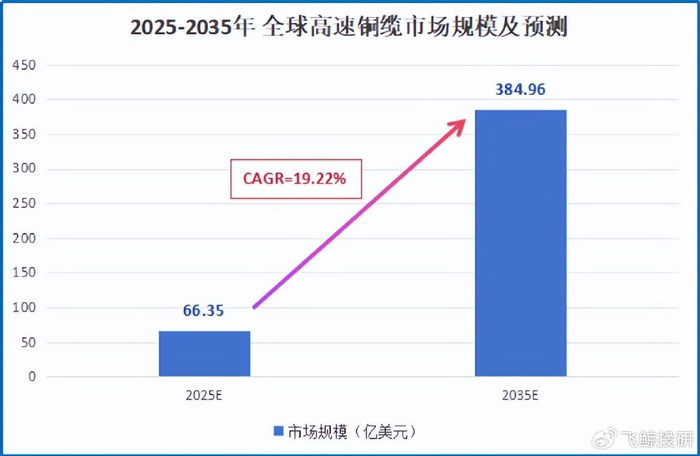 根据预测,2025-2035年,全球高速铜缆市场规模将由60多亿美元增长至近400亿美元,年复合增长率高达19.22%。