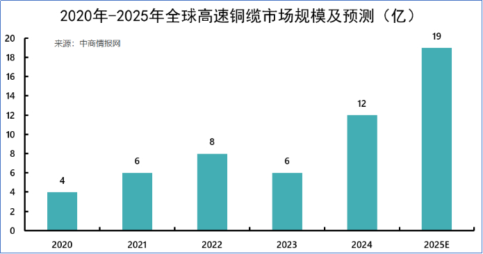 市场数据印证了这股热潮。2024年,全球高速铜缆市场规模约12亿美元,同比暴涨了100%。预计到2025年,这个数字将冲到19亿美元。这不再是那个增长缓慢的传统电线市场,而是一个被AI引擎点燃的新赛道。
