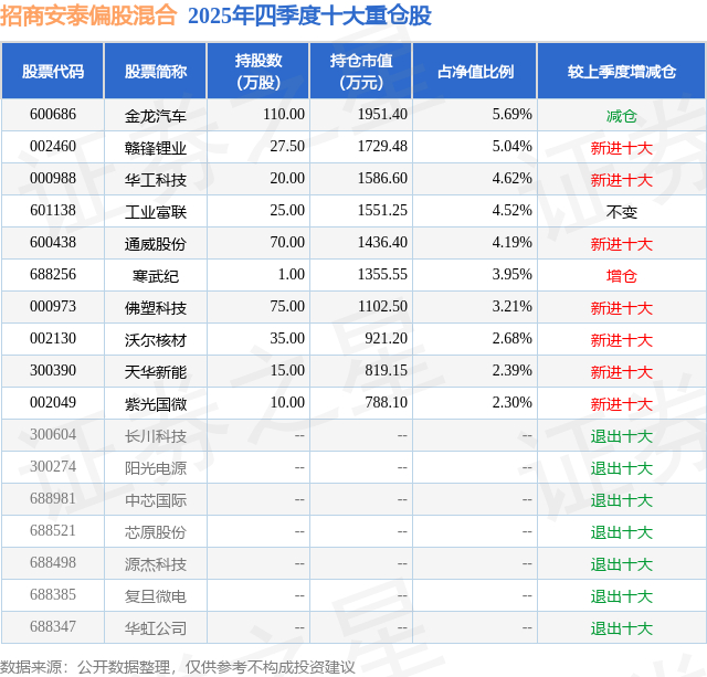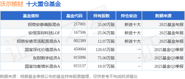 根据2025基金年报公募基金重仓股数据,重仓该股的公募基金共3家,其中持有数量最多的公募基金为招商基金的招商安泰偏股混合。招商安泰偏股混合目前规模为3.43亿元,最新净值0.4722(1月21日),较上一交易日上涨1.61%,近一年上涨31.61%。该公募基金现任基金经理为张西林 李正伟。张西林在任的基金产品包括:招商安博灵活配置混合A,管理时间为2018年6月14日至今,期间收益率为47.37%;招商均衡成长混合A,管理时间为2022年9月14日至今,期间收益率为7.58%;招商安弘灵活配置混合A,管理时间为2025年6月9日至今,期间收益率为18.56%。