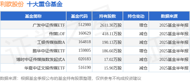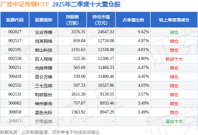 根据2025基金半年报公募基金重仓股数据,重仓该股的公募基金共6家,其中持有数量最多的公募基金为广发基金的广发中证传媒ETF。广发中证传媒ETF目前规模为25.63亿元,最新净值1.0571(9月30日),较上一交易日上涨0.62%,近一年上涨42.56%。该公募基金现任基金经理为罗国庆。罗国庆在任的基金产品包括:广发中证传媒ETF联接A,管理时间为2018年1月2日至今,期间收益率为6.37%;广发中证A100ETF联接A,管理时间为2019年5月27日至今,期间收益率为36.5%;广发中证创新药产业ETF,管理时间为2020年12月3日至今,期间收益率为-27.37%。