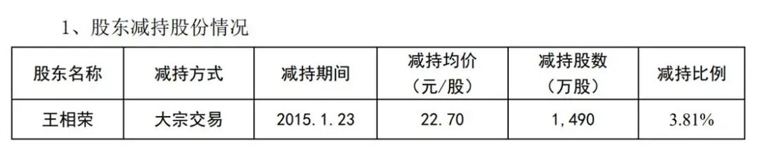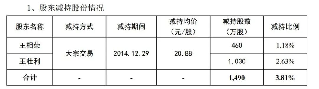 2014年12月,王相荣、王壮利减持了利欧股份1,490万股,变现3.11亿元。2015年1月,王相荣再度减持利欧股份1,490万股,变现3.38亿元。