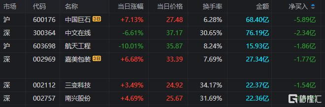 龙虎榜单日净卖出额前三为中文在线、航天工程、三变科技,分别为2.34亿元、1.86亿元、1.54亿元。