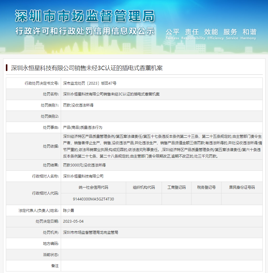 深圳永恒星科技有限公司销售未经3C认证的插电式香薰机案