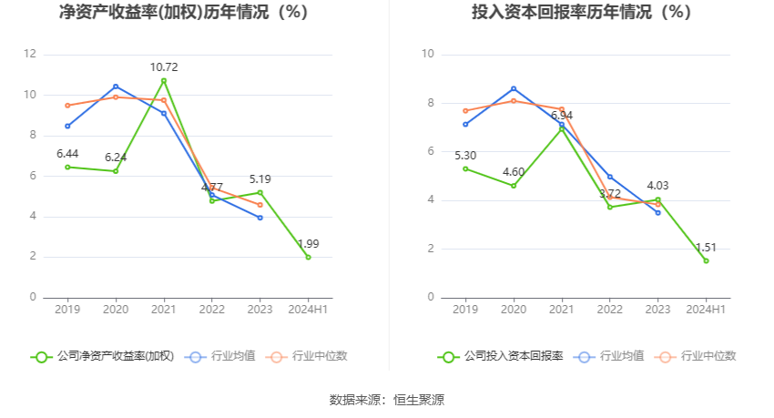 数据显示,2024年上半年公司加权平均净资产收益率为1.99%,较上年同期下降1.54个百分点;公司2024年上半年投入资本回报率为1.51%,较上年同期下降1.23个百分点。
