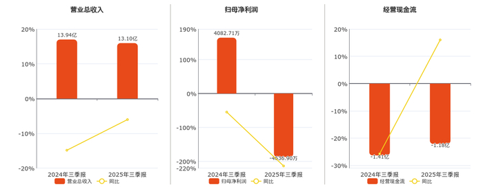 公司营业总收入为13.10亿元,较去年同报告期营业总收入减少8409.99万元,同比较去年同期下降6.03%。归母净利润为-4636.90万元,较去年同报告期归母净利润减少8719.61万元,同比较去年同期下降213.57%。经营活动现金净流入为-1.18亿元,较去年同报告期经营活动现金净流入增加2254.71万元。