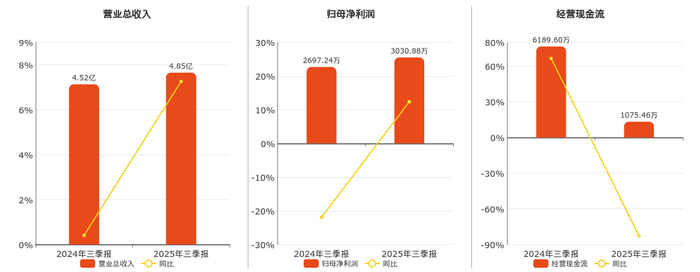 公司营业总收入为4.85亿元。归母净利润为3030.88万元。经营活动现金净流入为1075.46万元,较去年同报告期经营活动现金净流入减少5114.14万元,同比较去年同期下降82.62%。