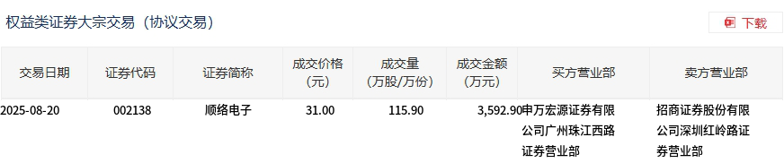 顺络电子今日大宗交易折价成交115.9万股,成交额3592.9万元